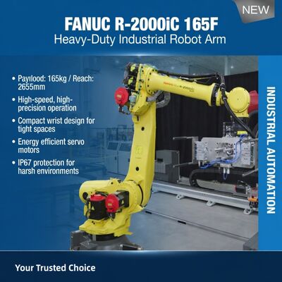 The R-2000iC/165F is Fanuc’s classic 165 kg payload robot with 2655 mm reach. It features a very slim wrist for fast welding cycles and high arm rigidity for handling heavy spot guns or large parts. This model has been a workhorse in automotive production for many years and is still one of the most common robots in body-in-white welding lines globally.